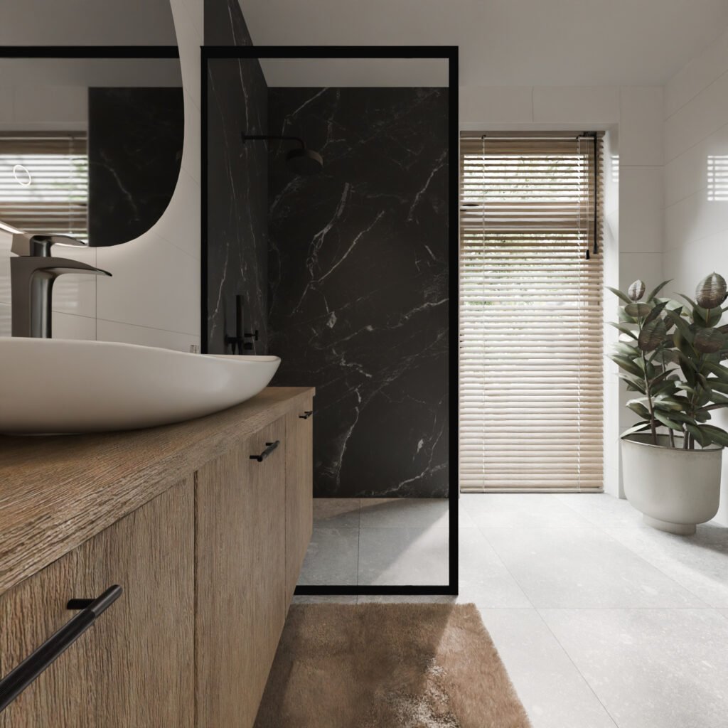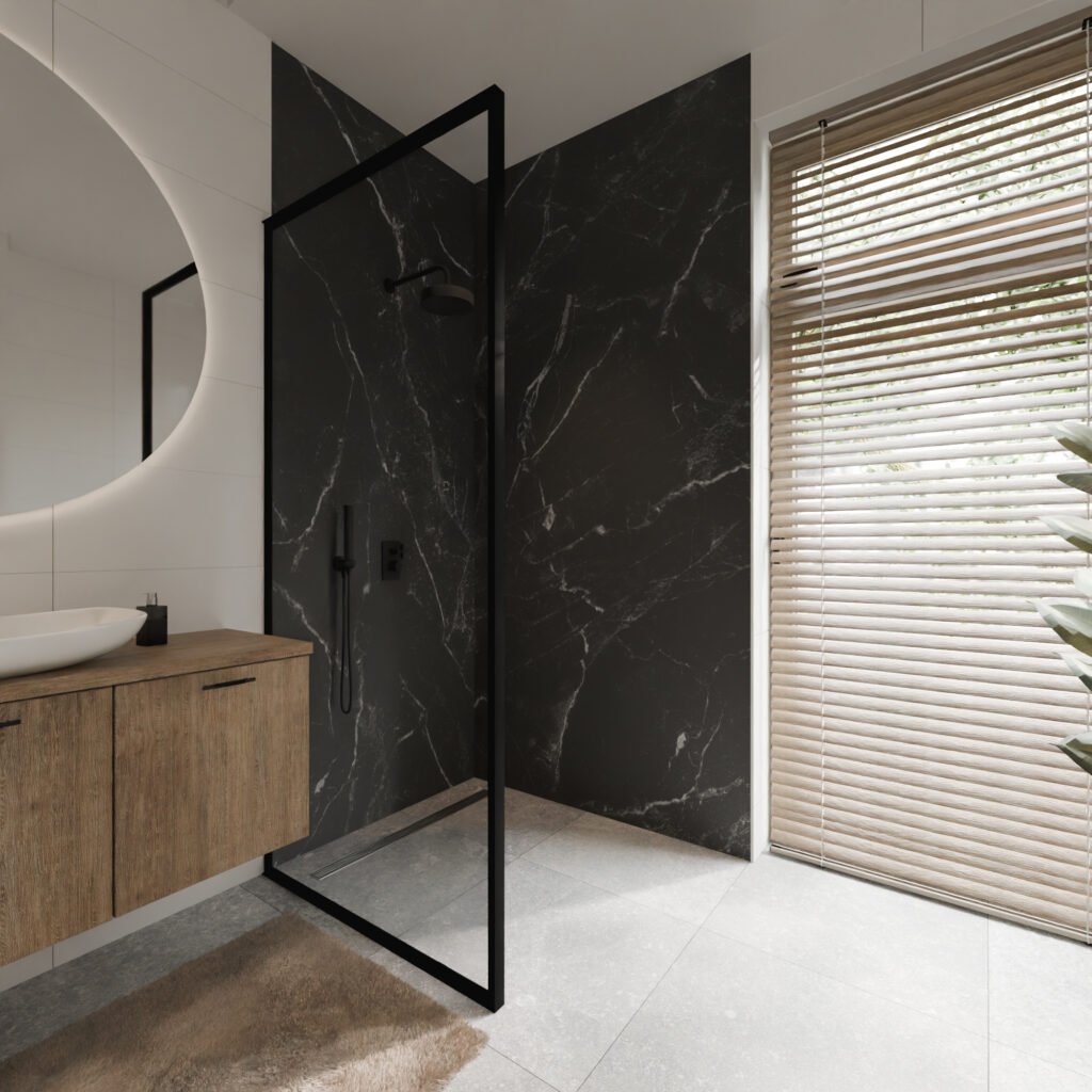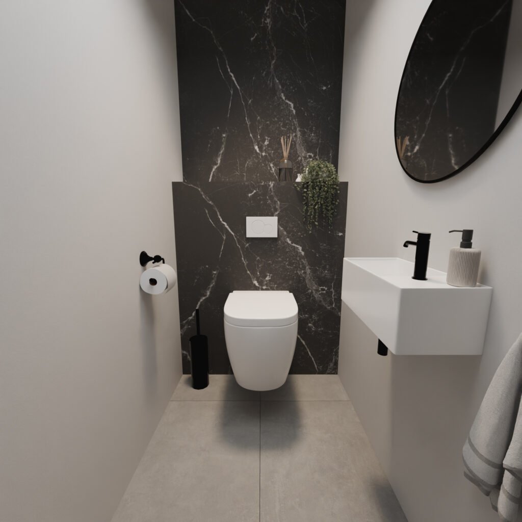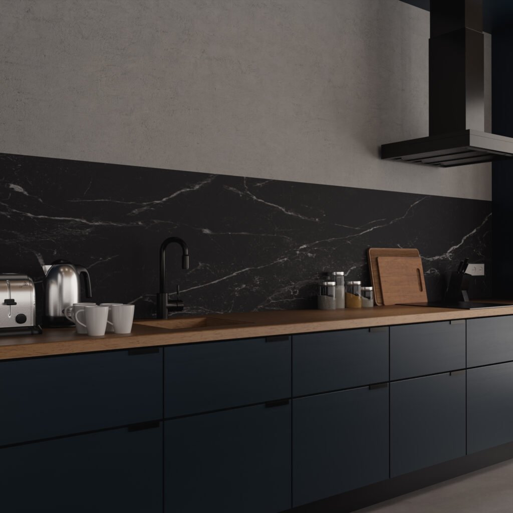 L’aspect marbre noir mat donne instantanément une touche luxurieuse à votre espace. Que vous l’utilisiez dans la cuisine, la salle de bain ou les toilettes – ce panneau s’intègre partout.